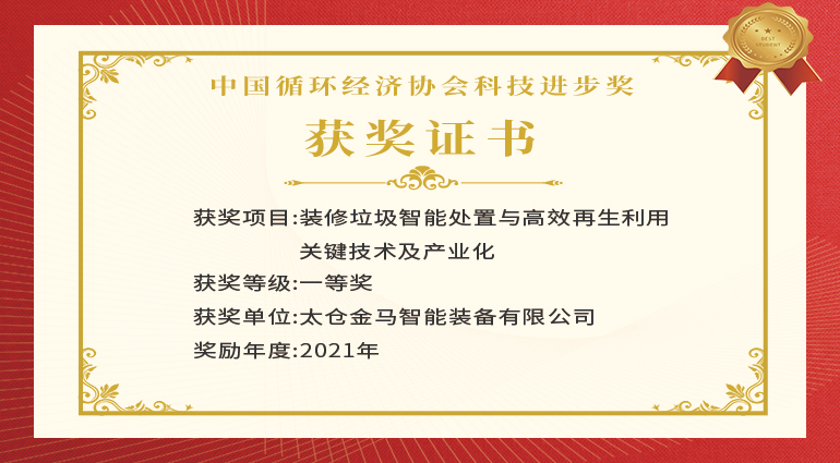 金馬裝備榮獲“中國循環(huán)經(jīng)濟(jì)協(xié)會(huì)科學(xué)技術(shù)獎(jiǎng)一等獎(jiǎng)”